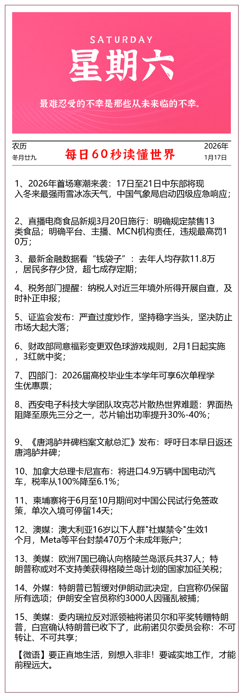- 1、2026年首场寒潮来袭:17日至21日中东部将现入冬来最强雨雪冰冻天气,中国气象局启动四级应急响应;